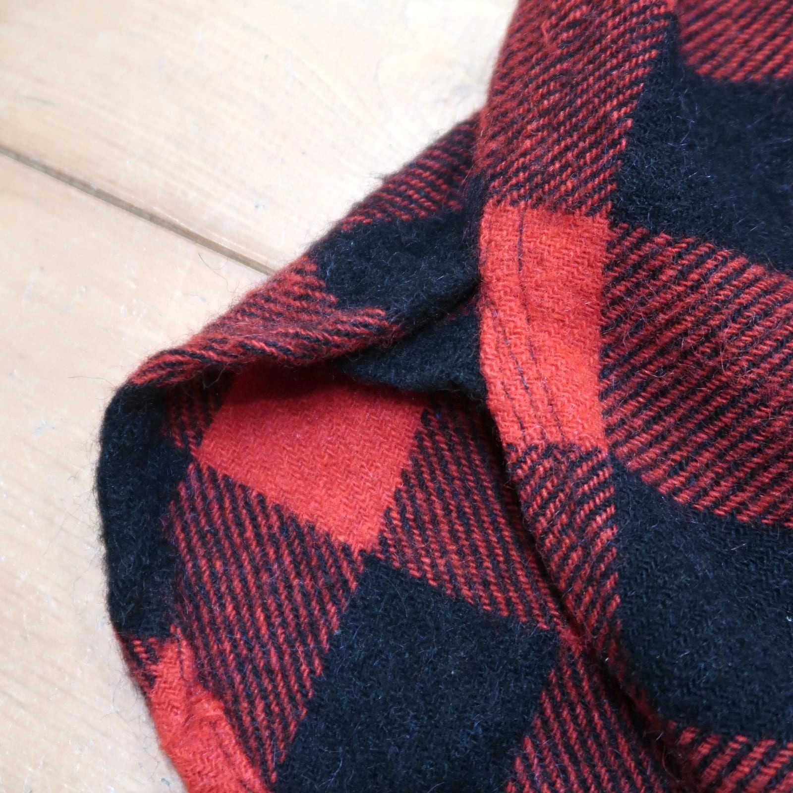 赤黒チェックのクラシックな配色に、ウールならではの柔らかい生地感で着心地の良い一着です。